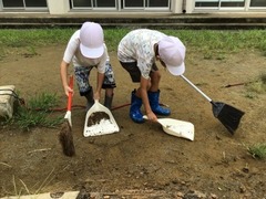 コロコロウンチをほうきとちりとりで一生懸命おそうじしています。