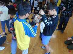 当日は、いくつかのグループに分かれ、「日本の伝統的な昔遊び」を紹介する活動をしました。3年生にとってはなじみのあるおもちゃばかりですが、台湾の小学生にとっては初めて見たり、使ったりするものもあります。英語を使ったり、表情やジェスチャーで伝えたりしながら交流する姿が見られました。さすがは子ども同士なので、あっという間に距離を縮め、笑顔いっぱいの時間となりました。最後に、特製缶バッジを手渡しして、お別れです。